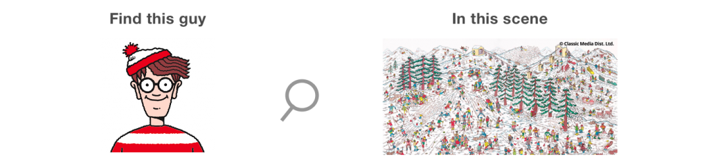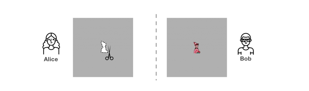 Alice cuts a hole in the opaque sheet of cardboard. She places the cutout part on the original scene. Here only Waldo is shown, his coordinates relative to the rest of the scene are still unknown.